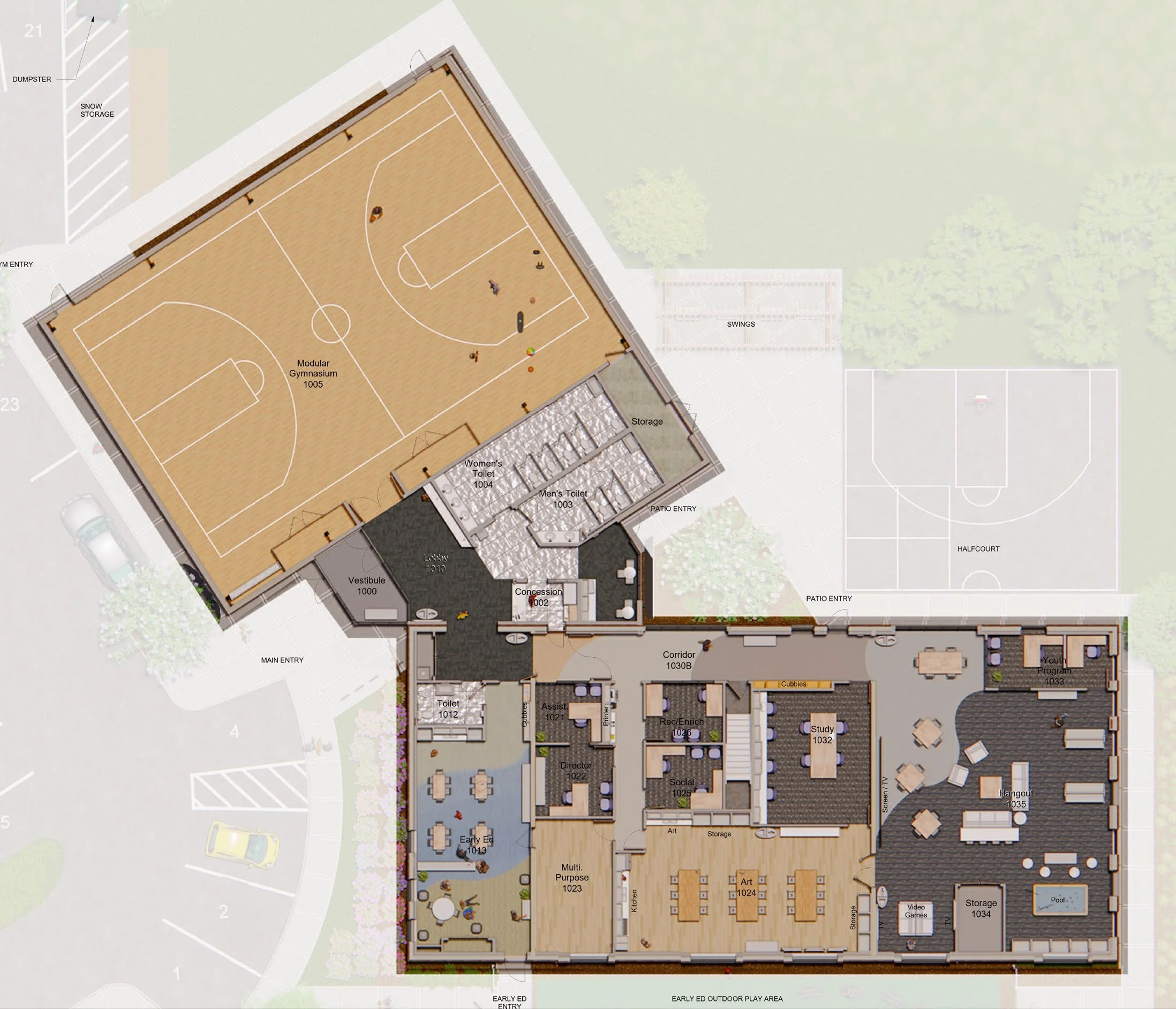 Outside, the site will include a fenced early childhood play area, a sport patio, open lawn, and a half-court basketball area. Basic pedestrian improvements are planned for the surrounding area, including sidewalk connections and a crossing beacon.
